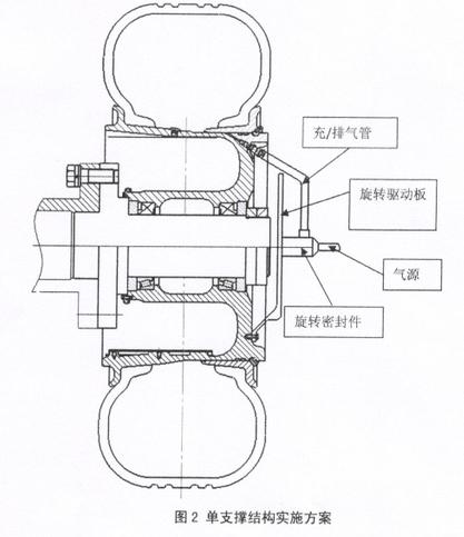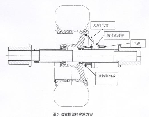 對于單支撐結構,可以在試驗過程中按圖2所示的方式連接輪胎壓力監(jiān)控裝置,實現(xiàn)較為方便。