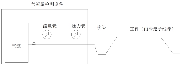 2. 工作原理:工件一端水接頭開放,另一端水接頭通過接頭接入設(shè)備。開通氣源按設(shè)定壓力值調(diào)節(jié)并穩(wěn)定,記錄流量表讀數(shù)值。原理圖如下