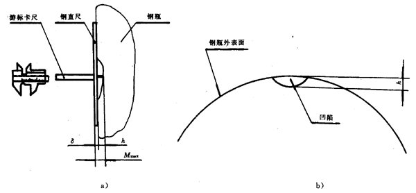 以凹陷的弦為基準測量深度,量具為高度游標卡尺或直尺,直尺應(yīng)沿氣瓶軸線放置,直尺長度應(yīng)大于凹陷直徑的三倍,如圖B1a)所示。