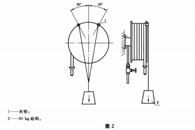 按規(guī)定安裝試樣并灌水。如圖2所示在卷盤側板上懸掛質量為80 kg砝碼。72 h后去除砝碼,再按規(guī)定進行試驗,其結果應符合規(guī)定。旋轉軸僅為1個支承點的卷盤,懸掛點應距支承點最遠。旋轉軸多于1個支承點的,懸掛點應通過各支承點的支承中心。