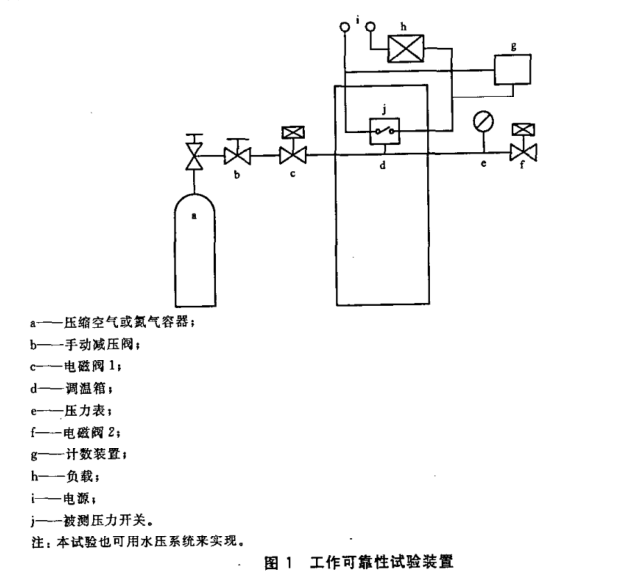 將普通型壓力開(kāi)關(guān)按其正常工作位置安裝在試驗(yàn)設(shè)備上,其常開(kāi)觸點(diǎn)接額定負(fù)載,每次動(dòng)作由計(jì)數(shù)裝置進(jìn)行記錄。